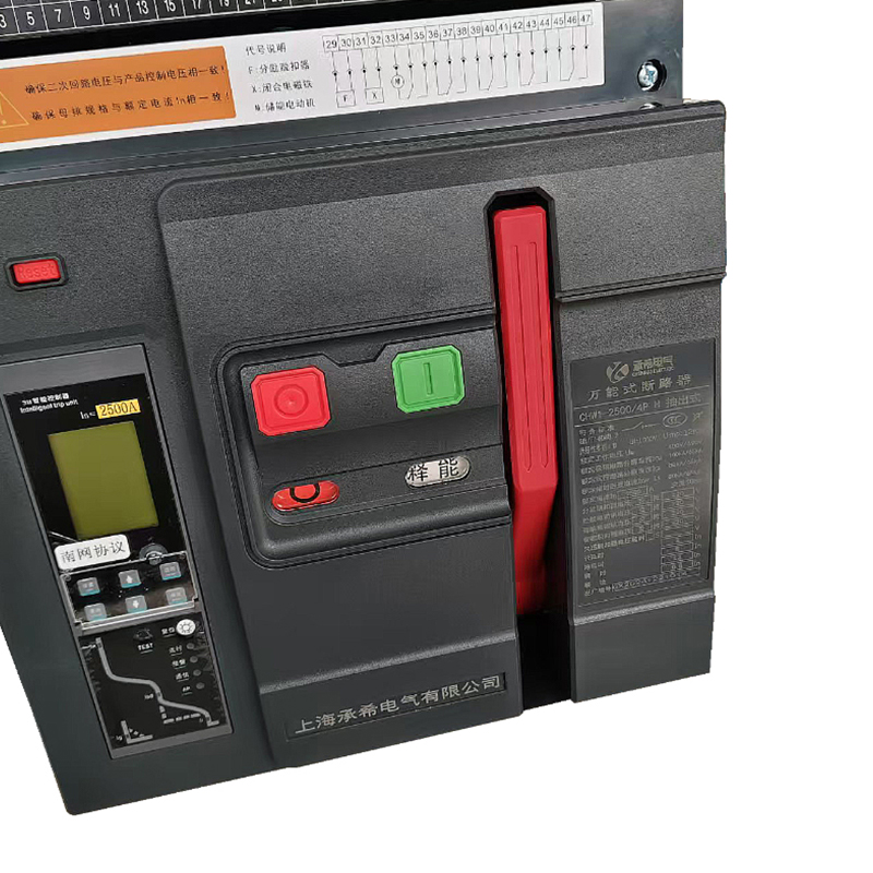 Воздушный выключатель серии ACB CHW1-2000, предназначенный для защиты и управления электрическими системами. Ключевые компоненты включают в себя: кнопку сброса неисправности, кнопку отключения, ручку переключения (для управления цепью), ручку накопления энергии, окно индикатора закрытия/открытия (для отображения рабочего состояния) и окно с инструкциями по сбросу энергии. Он также оснащен цифровым дисплеем для мониторинга в режиме реального времени, что делает его подходящим для средних и крупных систем распределения электроэнергии (например, промышленных, коммерческих объектов), которым требуется надежная защита от перегрузки/короткого замыкания и обзорность работы.
